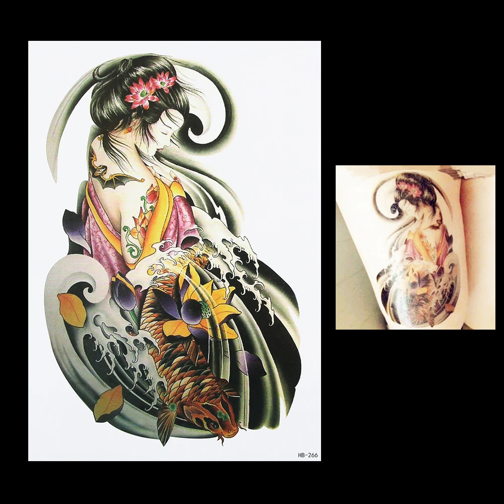 Check Price New Arrival 1pc Sexy Women Men's Fake Fish Carp Beauty Geisha Girl Flower Picture Design HB266 Temporary Body Art Tattoo Sticker fake-body-tattoos This instant